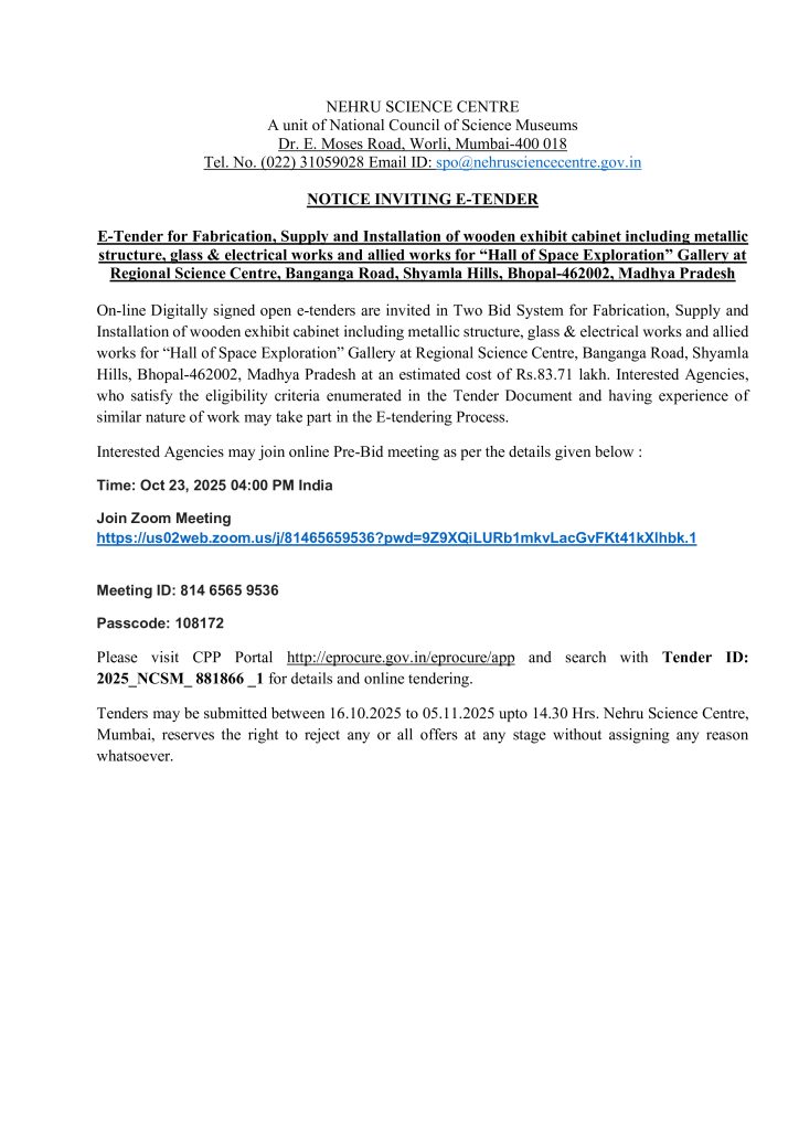 Tenders may be submitted between 16.10.2025 to 05.11.2025 up to 14.30 Hrs. Nehru Science Centre, Mumbai, reserves the right to reject any or all offers at any stage without assigning any reason whatsoever.