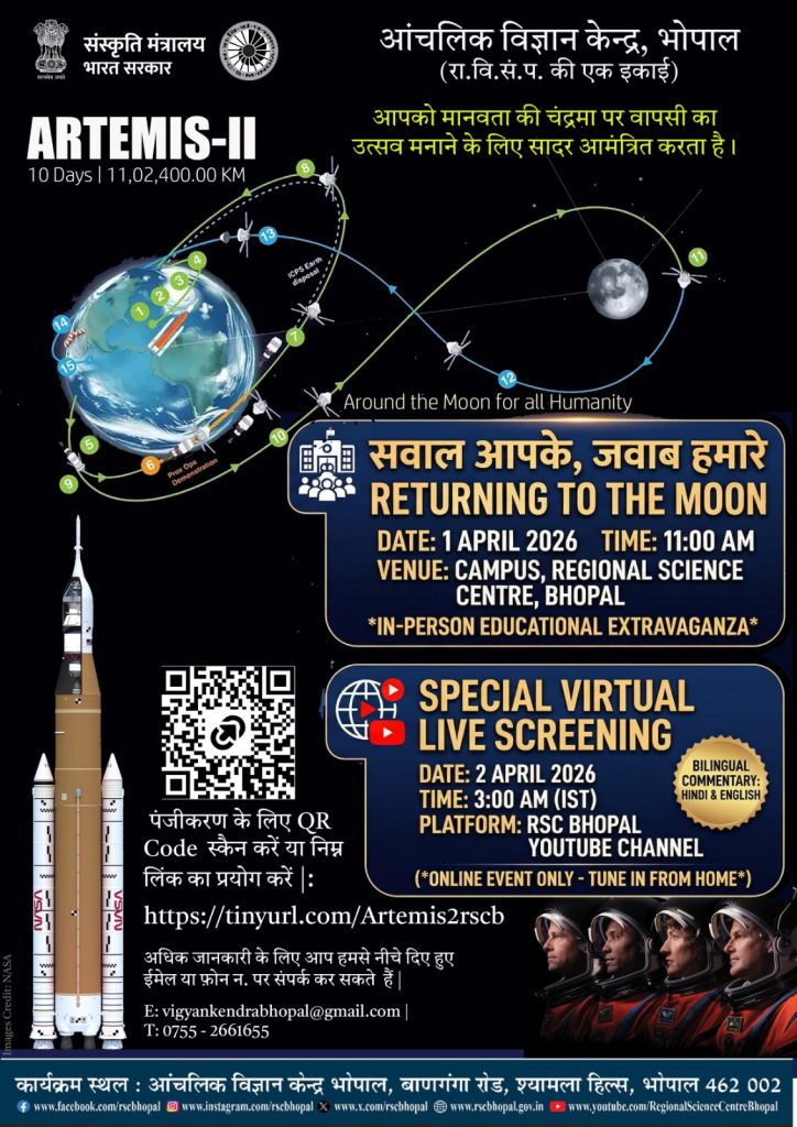 Regional Science Centre, Bhopal, warmly invites students, teachers, and all space enthusiasts to a special educational programme on NASA’s Artemis-II Mission—marking humanity’s historic return to the Moon after decades.